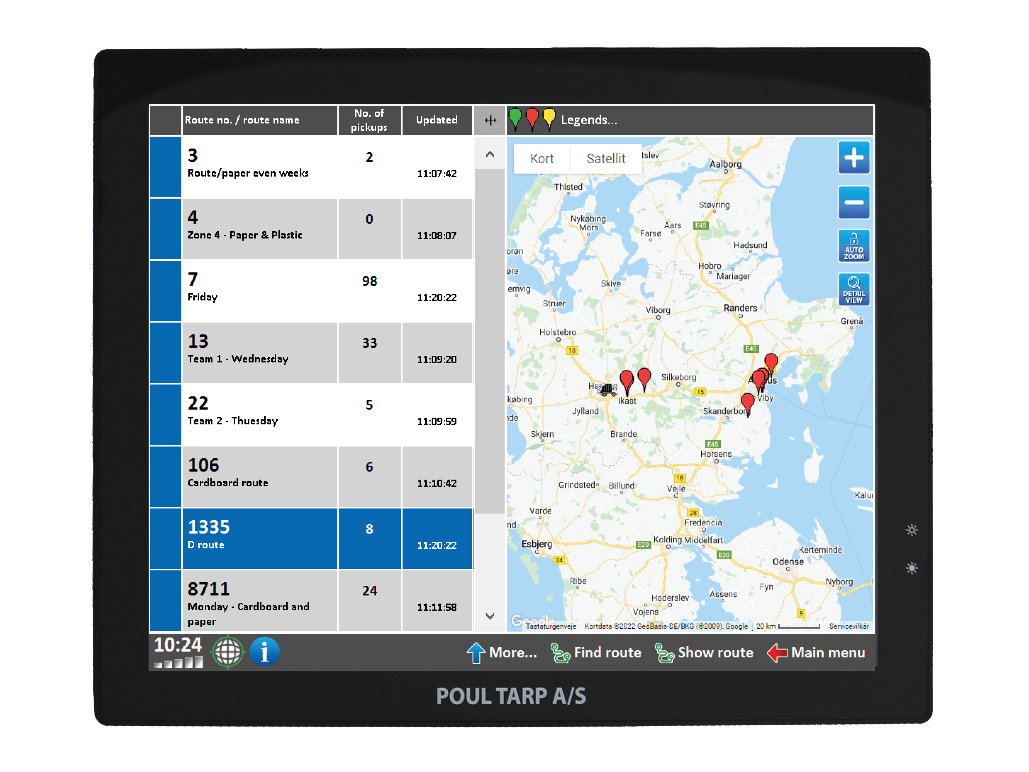 Komplet løsning fra POUL TARP A/S til registrering og udveksling af ruter og veje-data mellem kontoret, bilen og chaufføren, samt til fakturering af kunden.